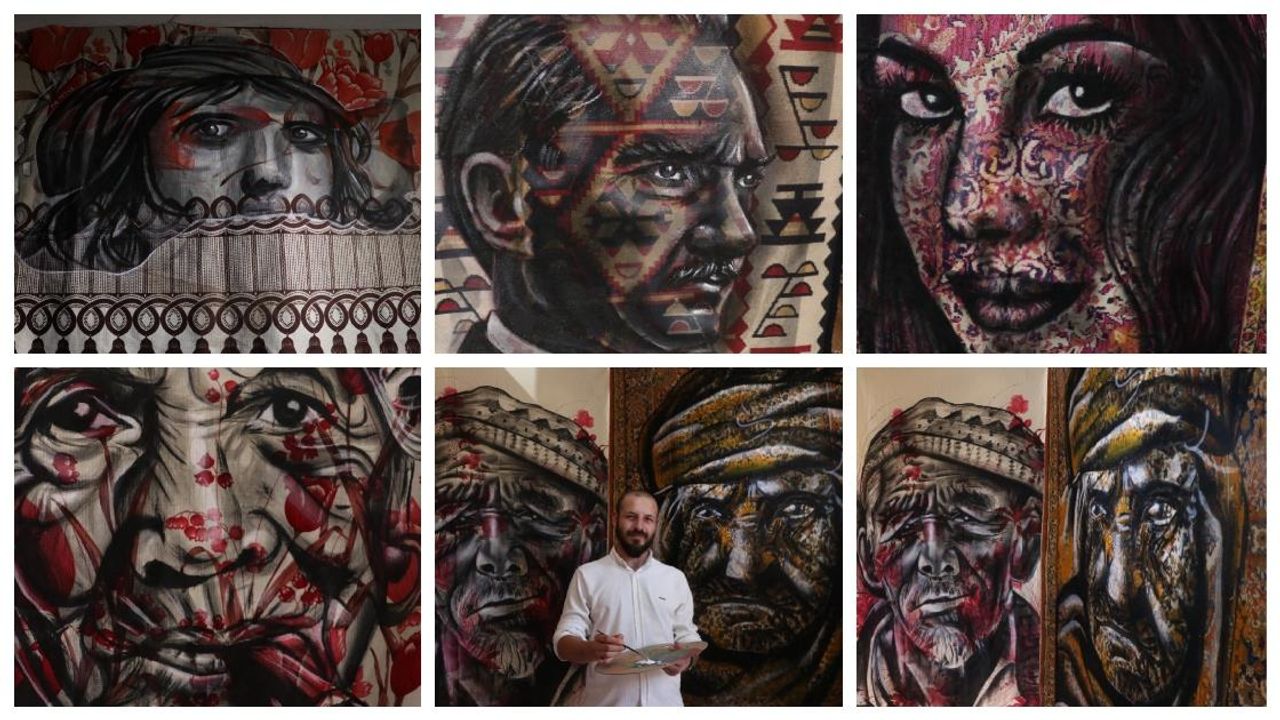 Genç ressam, eskiyen halı ve perdelerin üzerine yağlı boya ve karakalem ile çeşitli resimler yaparak satışa sunuyor.