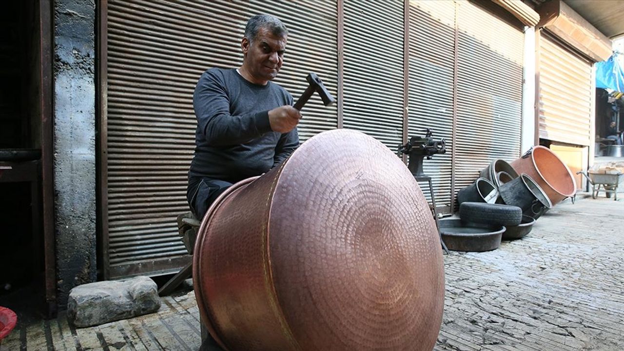 KAHRAMANMARAŞ (AA) - Ustaların sabahın erken saatlerinde tezgahların başına geçmesiyle Bakırcılar Çarşısı'nda çekiç sesleri yankılanıyor.