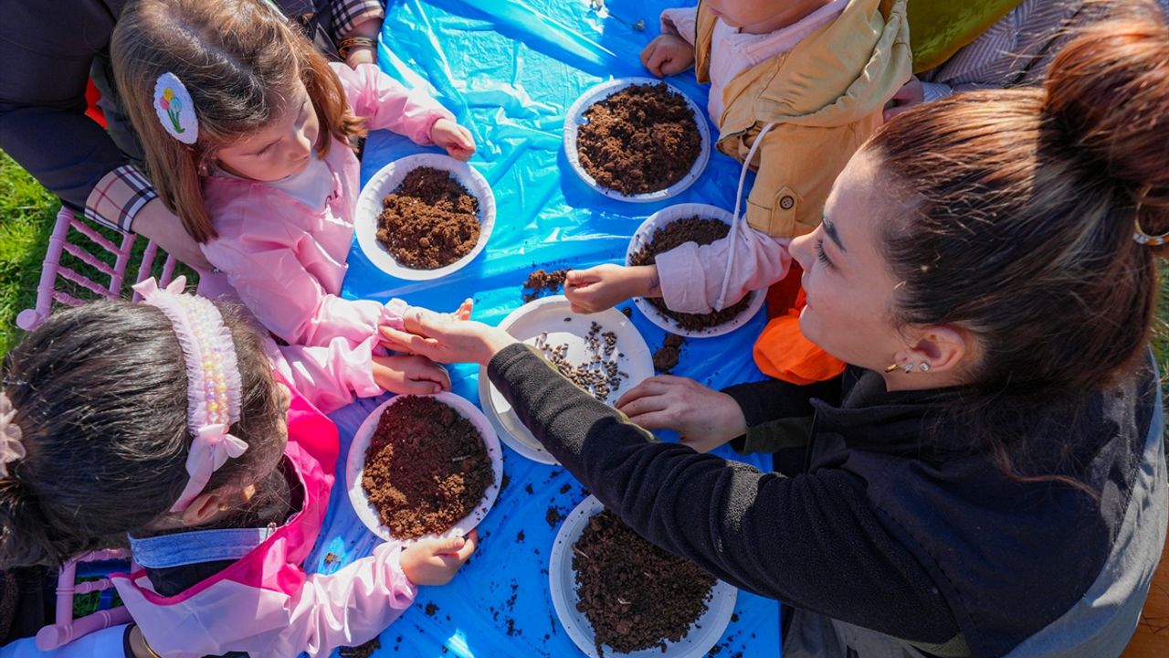 Adalet Anaokulu'nda düzenlenen etkinlikte de öğrenciler ebeveynleri, öğretmenleri ve orman mühendislerinin yardımıyla kazdığı toprağı çamur haline getirip içerisine tohum koydu.