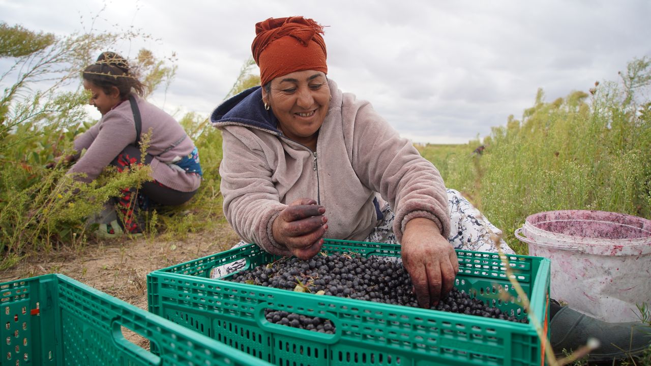 Tarım işçileri tarafından özenle toplanan aronya meyveleri kasalara doldurulup işlenmek üzere tesislere gönderiliyor.