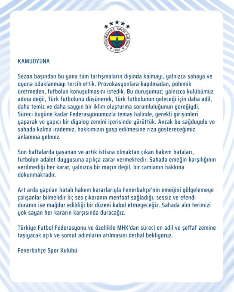 Fenerbahçe Spor Kulübü, son haftalarda art arda yaşanan hakem hatalarına sert tepki göstererek, Türkiye Futbol Federasyonu ve MHK'ya 'adil ve şeffaf' adımlar çağrısında bulundu.