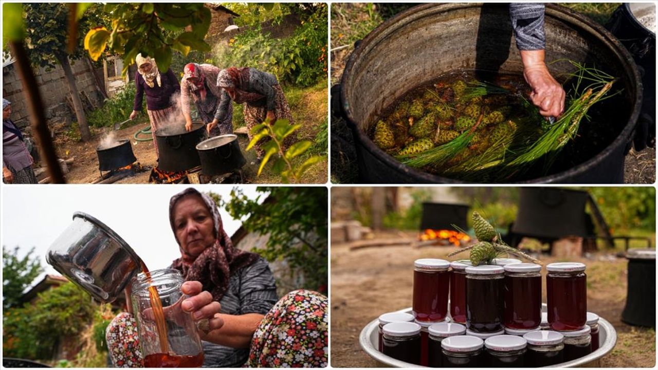 Yörenin zenginliklerini değerlendiren kadınlar, imece geleneğini yaşatarak kızılçam kozalaklarından pekmez elde ediyor.
