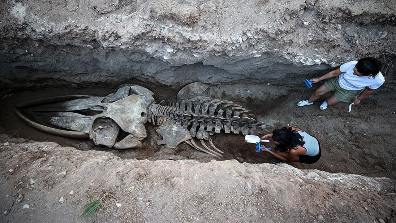 İki gün içinde iskeletin tamamı topraktan çıkarılacakProjeyi yürüten MEÜ Su Ürünleri Fakültesi İşleme Teknolojisi Ana Bilim Dalı Öğretim Üyesi Prof. Dr. Ayas da kazı çalışmalarında 4. günü geride bıraktıklarını kaydederek, 'Şu an kafa, boyun omurları ve göğüs bölgesinin tamamını toprak altından çıkarttık. Bel ve kuyruk omurları kısmı kaldı. İki gün içerisinde de tüm iskeleti müzemizin bahçesinde çıkartmayı planlıyoruz.' bilgisini verdi.