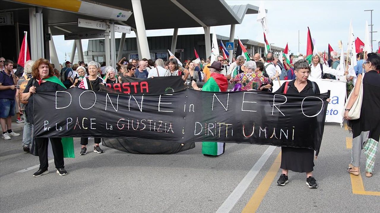 ROMA (AA) - İsrail saldırısı altında bulunan Gazze'deki durumu ve Filistinlilerin yaşadığı sıkıntıları Venedik Film Festivali çerçevesinde gündeme getirmek isteyen binlerce kişi, festivalin yapıldığı Lido Adası'ndaki Santa Elisabetta Meydanı'nda bir araya geldi. Yaklaşık 700 kişi de Filistin bayraklarıyla donattıkları küçük bir vapurla Lido Adası'na ulaştı.